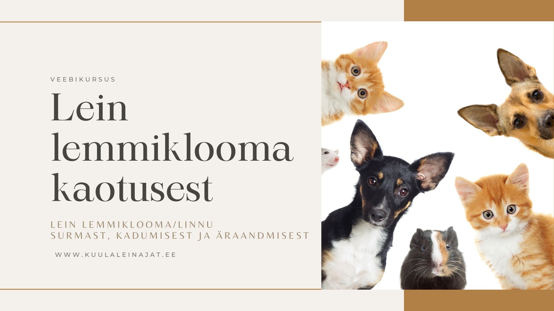 Võib tunduda, et kursus keskendub vaid koertele ja kassidele, kuid see ei vasta tõele! Nad on valitud keskseteks loomadeks, kuna nendega on enamustel seos. Meie emotsionaalne side ei ole piiratud koerlastega ega kaslastega. Me võime süvitsi armuda ka teiste loomade või lindudega.